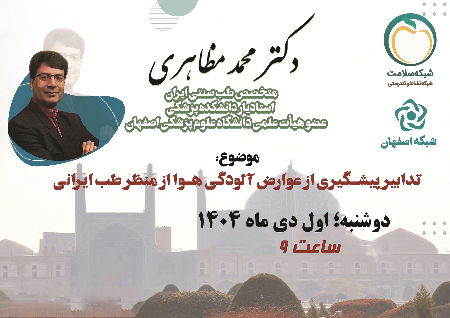 تدابیر پیشگیری از عوارض آلودگی هوا از منظر طب ایرانی با حضور دکتر محمد مظاهری در سیمای اصفهان و شبکه سلامت از ساعت نه الی ده صبح روز یکم دیماه ( دوشنبه)